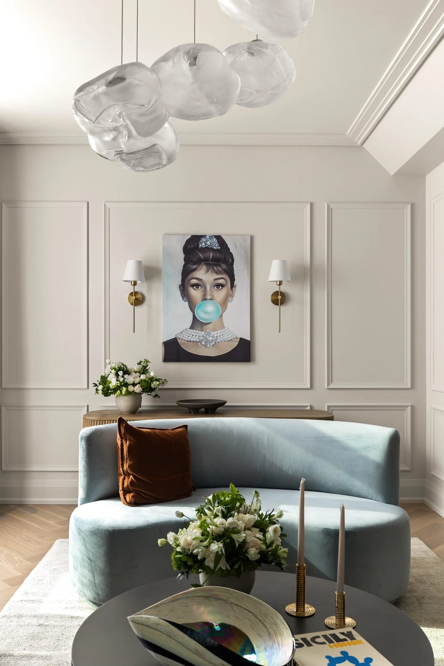 Living room with a light blue velvet sofa, a brown pillow, a floral arrangement, candles, and modern wall art of a woman blowing bubble gum.