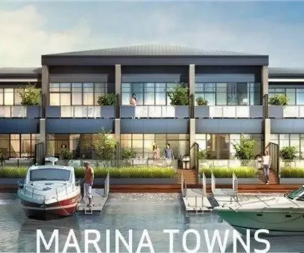 Modern waterfront residential building with balconies, surrounded by greenery and boats docked at the marina, with the text 'Marina Towns' at the bottom.