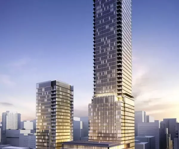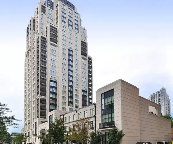 A tall modern high-rise building with balconies and large windows sits next to a lower, contemporary building with a glass facade, in an urban cityscape under a light blue sky.